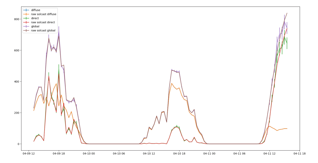 Here the Ghi from solcast, sunlight 3 and sunlight 2 and Ghi traced should be the same. It works pretty well in the morning, but in the afternoon the measurements are consistently lower than solcast and the simulation. This maybe from the sensors not being perfectly flat or pointing due south. I’ve adjusted the sensor rig to correct that, but haven’t been able to get back out to collect that data.