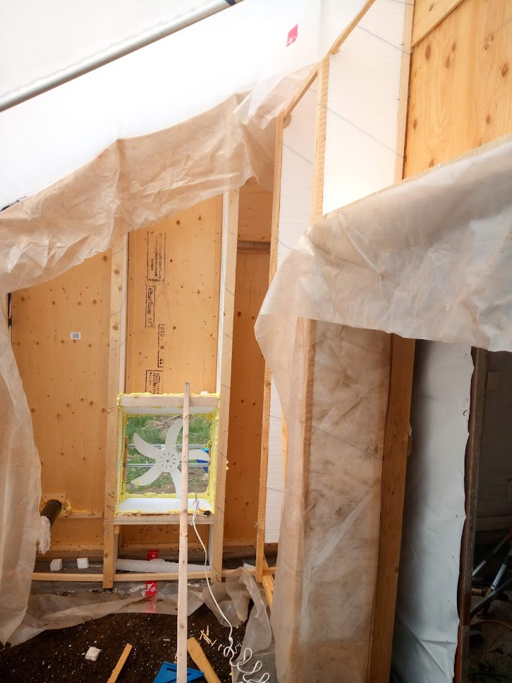 This week I insulated the north, east, south walls of the greenhouse with 12” thick cellulose. That in the end seemed to work pretty well, but the blower I had would get clogged if I tried to do dense packed cellulose. So I’ll have to measure the true R value with heat flux sensor but I think it should be sufficient.