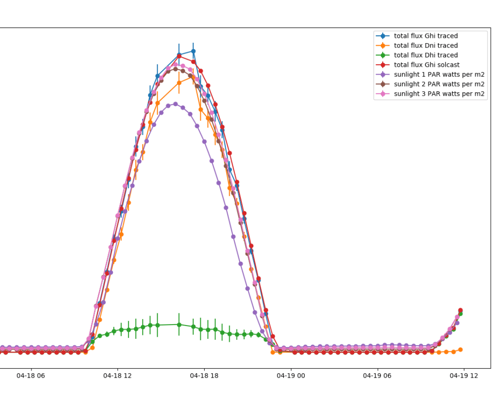 This was a short week due to the Easter holiday, so I’m just getting to the update now. I deployed two boxes for ray tracing with sensors in the field by the test greenhouse. Then I used rayctracer to simulate the flux on the sensor using solcast data. The bare sensor agreed well with solcast global horizontal flux, so this is another validation of the rayctracer. I still need to collect the sensor data to compare.
