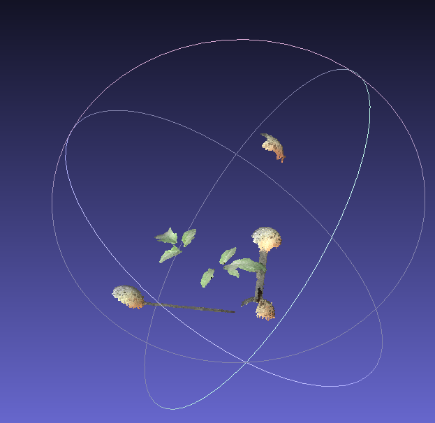 Using the program Cloud Compare, I can then make a virtual model, which pretty simple, just 4 spheres. By clicking on the scan of each model sphere, and the corresponding virtual model sphere, the computer reorients the plant to match the orientation of my virtual model. This sadly requires some human input, but I think that’s kind of inevitable.